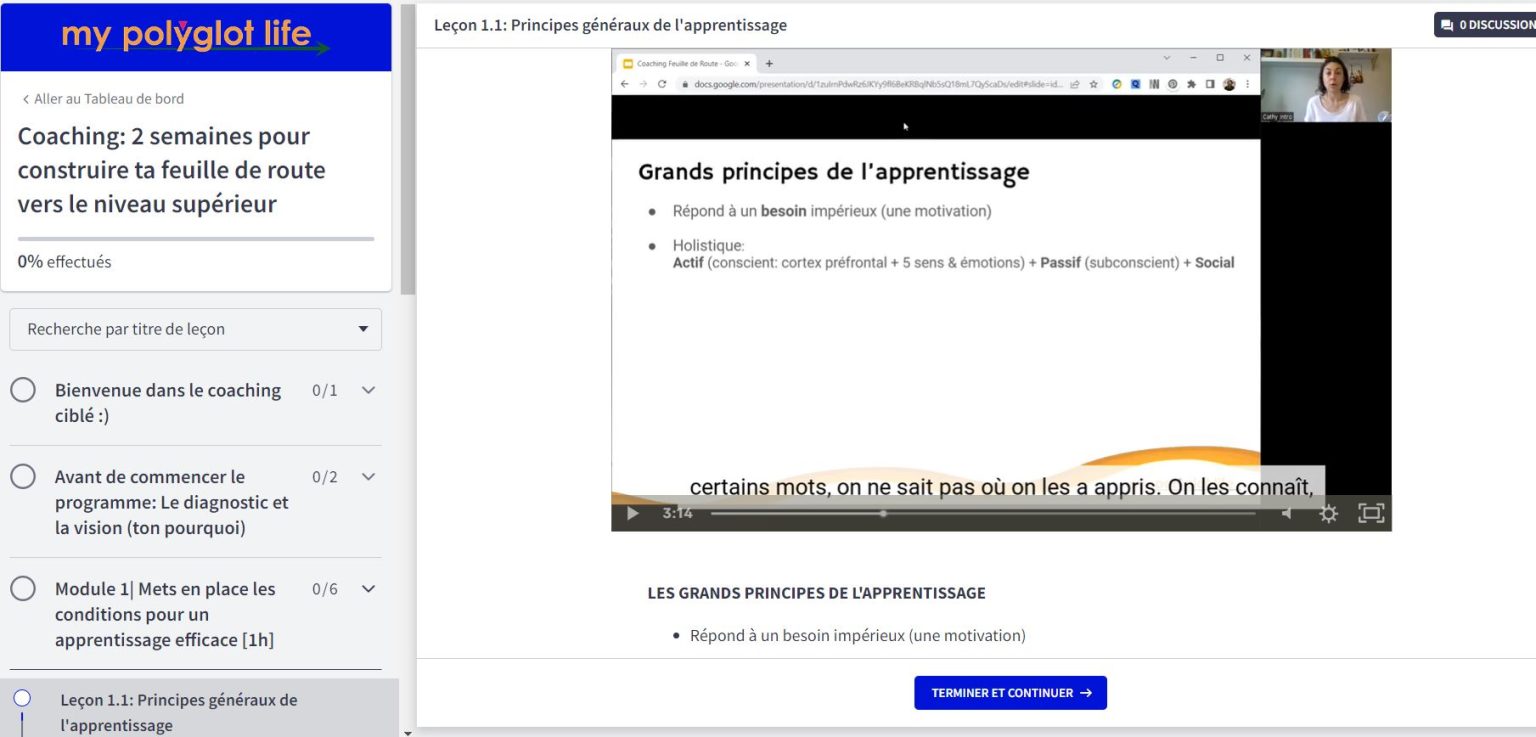 Language learning is a lifelong project. After French, you may want to take on another challenge and learn another language. The learning process is broadly the same, but you may need to make a few adjustments. The program can help you here too. Our trajectory is never a straight line. This course is like having a coach available at any time, inviting you to self-reflect in order to move forward.