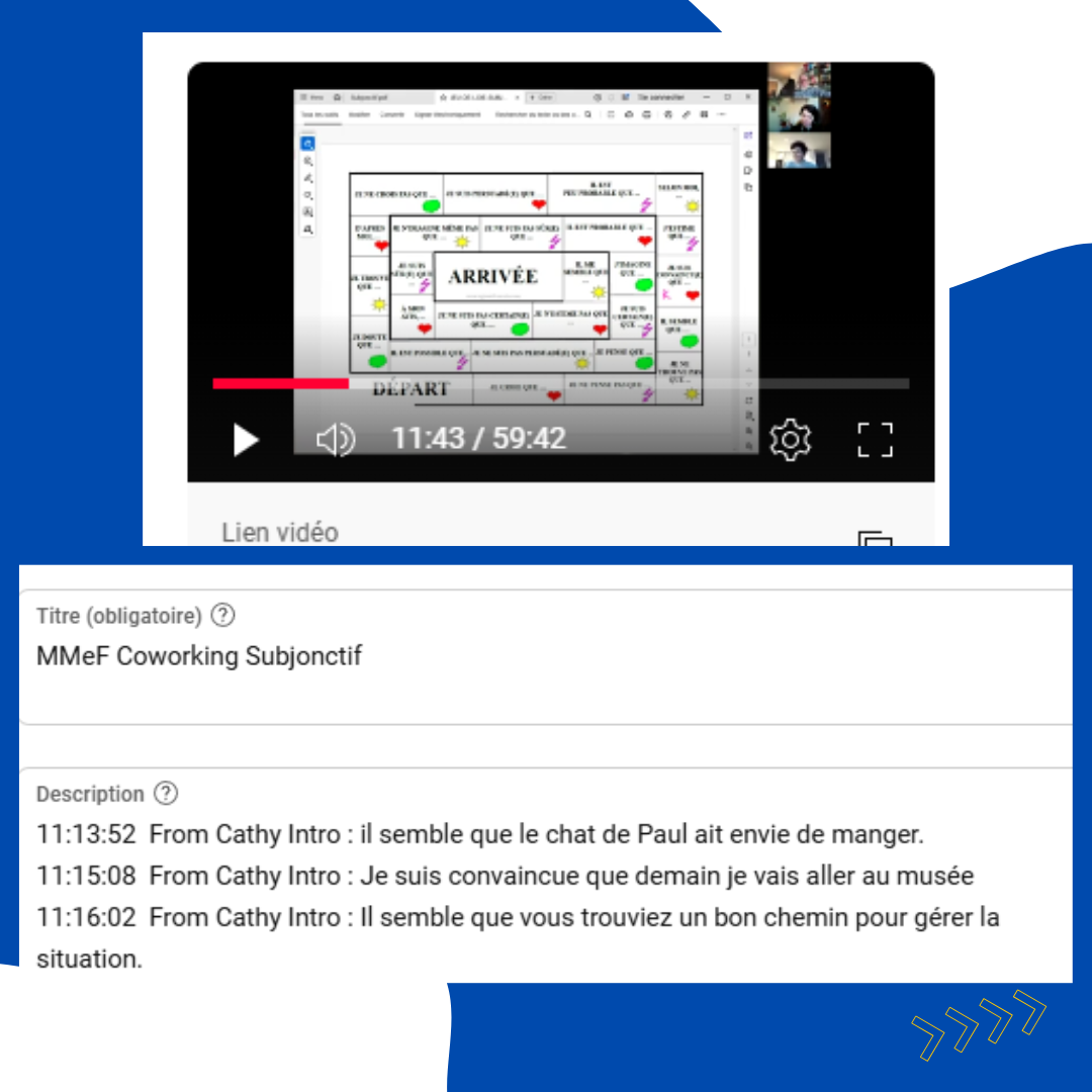 J'aime la flexibilité, je peux regarder les leçons quand j'ai le temps. J'ai essayé de participer le plus possible aux rencontres. J'ai aimé l'écriture même si je n'ai pas pu finir toutes les consignes. Mon préféré était les vidéos de shadowing.
